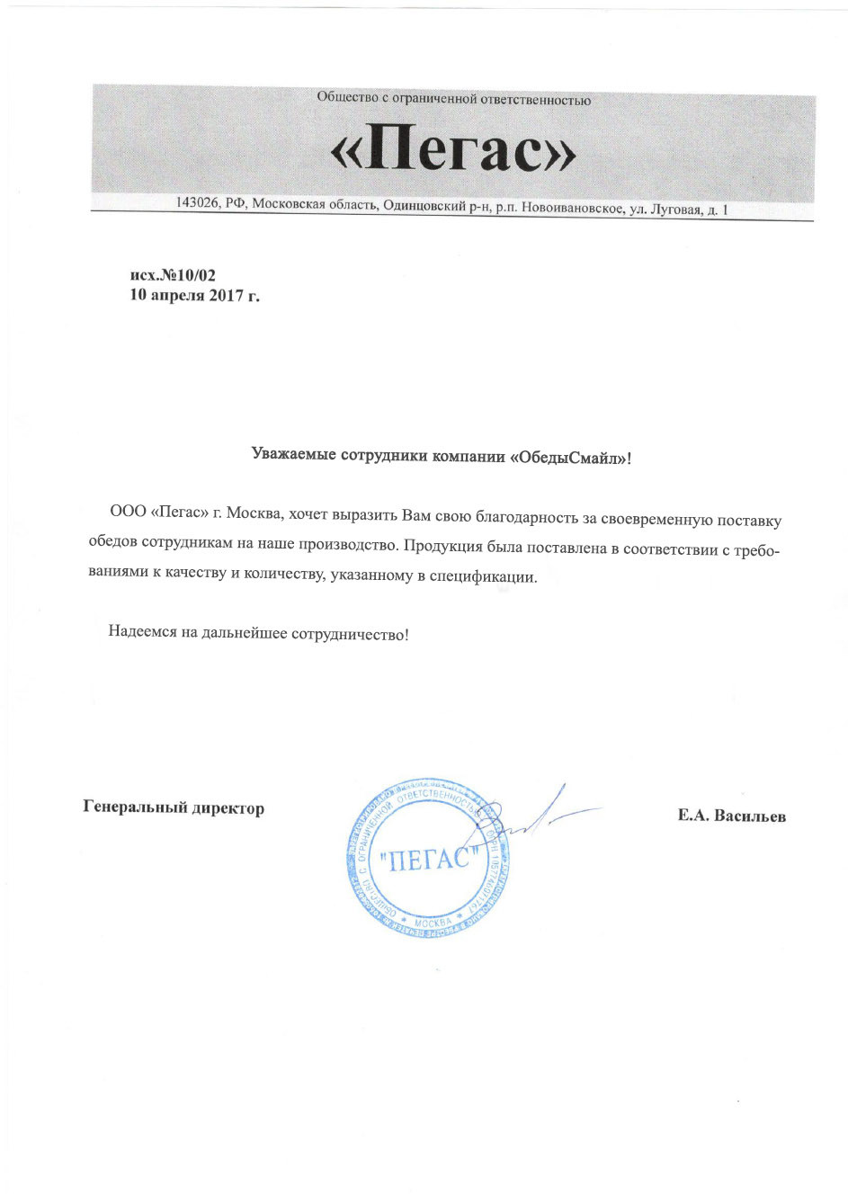 За период нашего сотрудничества Вы проявили себя очень надежным партнером. Особо следует отметить компетентность и высокую квалификацию поваров и курьеров компании «ОбедСмайл».